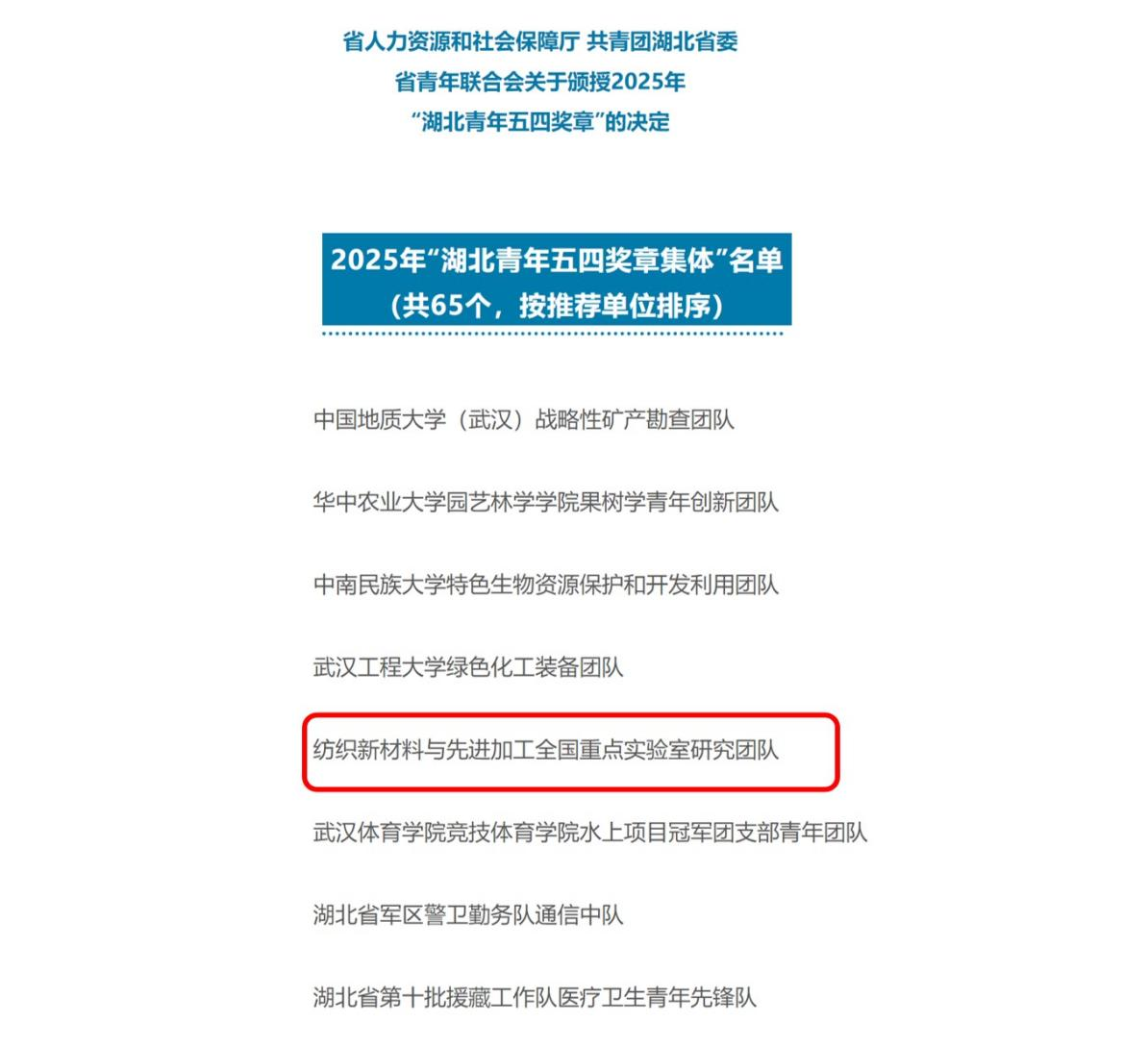 为弘扬先锋力量、彰显青年担当,生动诠释荆楚大地新时代青年踔厉奋发的精神风貌,激励广大青年勇立潮头、建功立业,湖北省人力资源和社会保障厅、共青团湖北省委、湖北省青年联合会于4月30日联合发布表彰决定,bevictor伟德官网纺织新材料与先进加工全国重点实验室研究团队荣获2025年“湖北青年五四奖章集体”,这一荣誉充分彰显了该研究团队在纺织新材料科技创新领域的突出贡献。据悉,“湖北省五四青年奖章”是授予湖北优秀青年的最高荣誉,旨在树立政治进步、品德高尚、贡献突出的优秀青年典型,反应当代湖北青年的精神品格和价值追求。