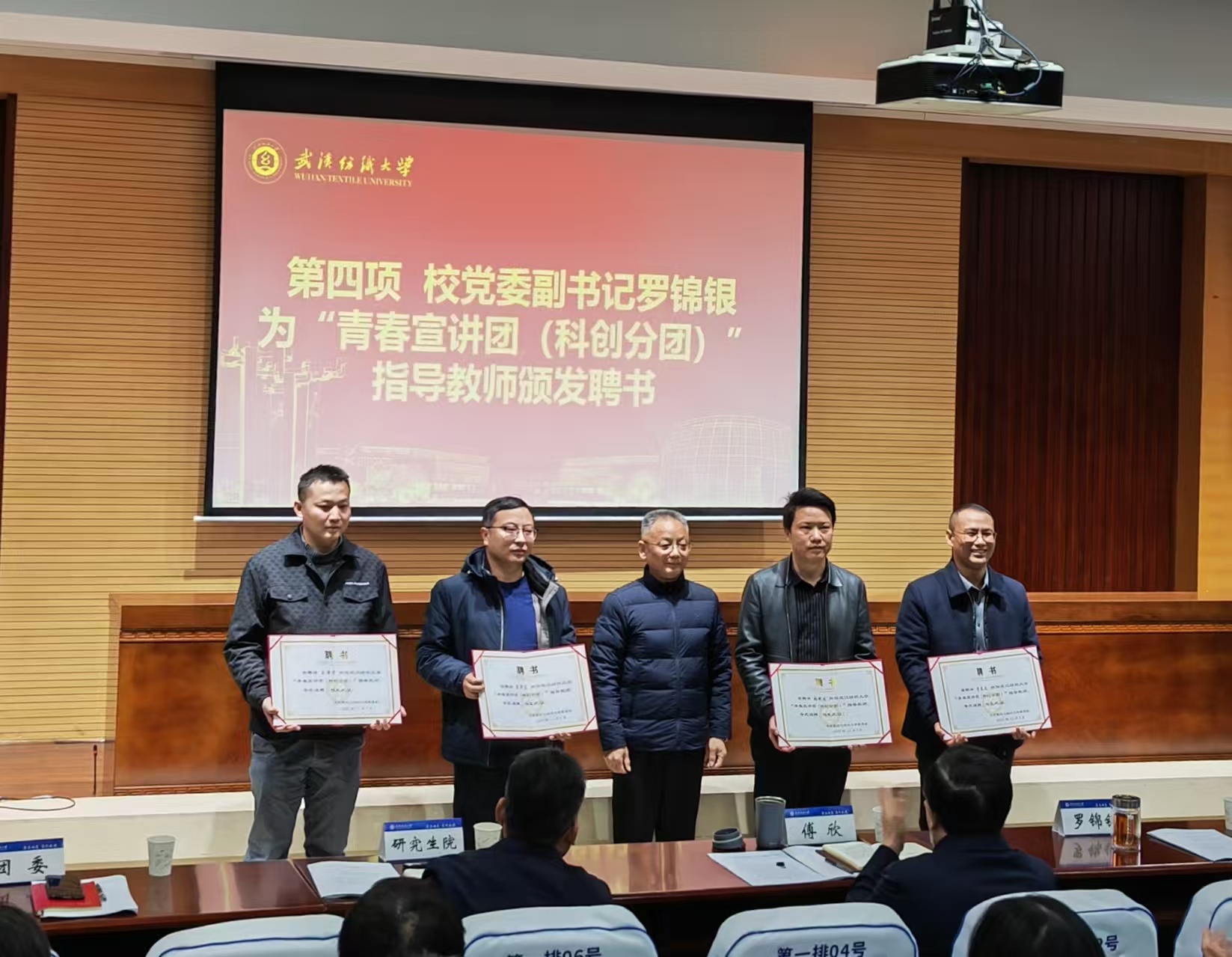 罗锦银为学校学习宣传党的二十届四中全会精神“青春宣讲团(科创分团)”指导教师代表颁发聘书,并发出宣讲动员,勉励大家讲好新时代科创报国的纺大故事。