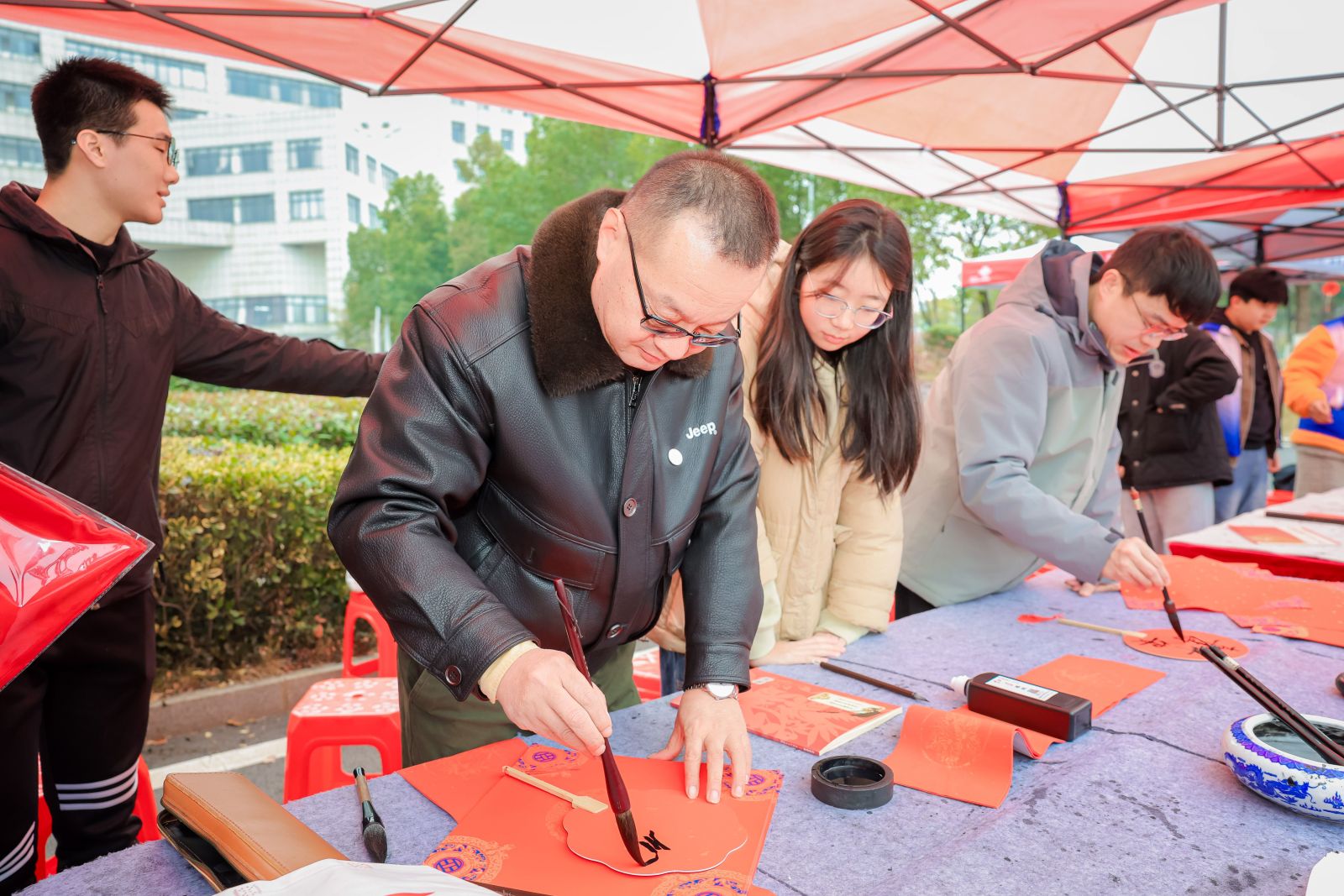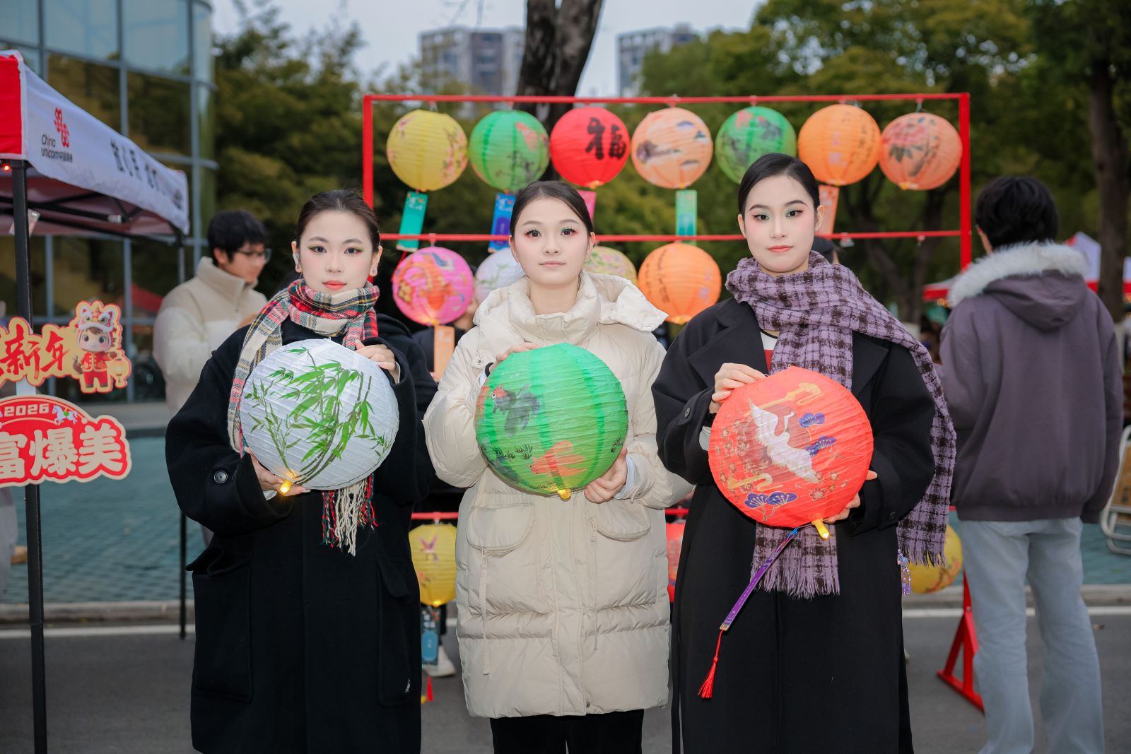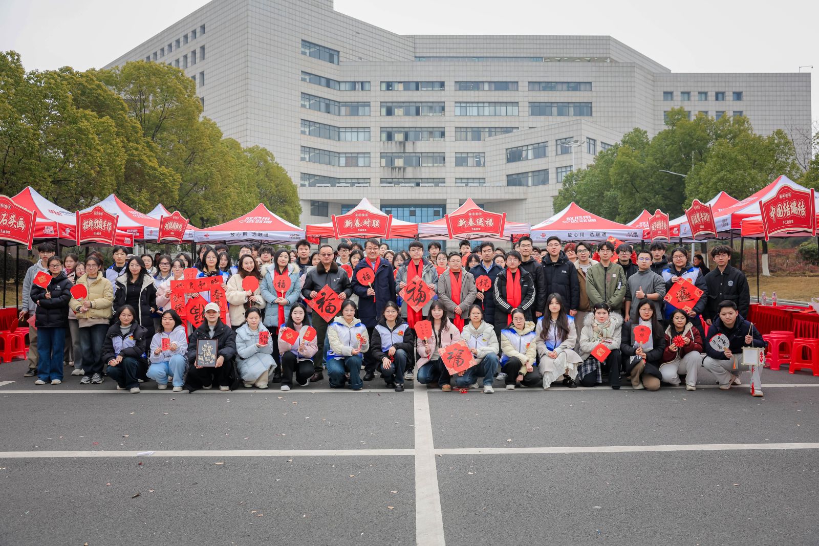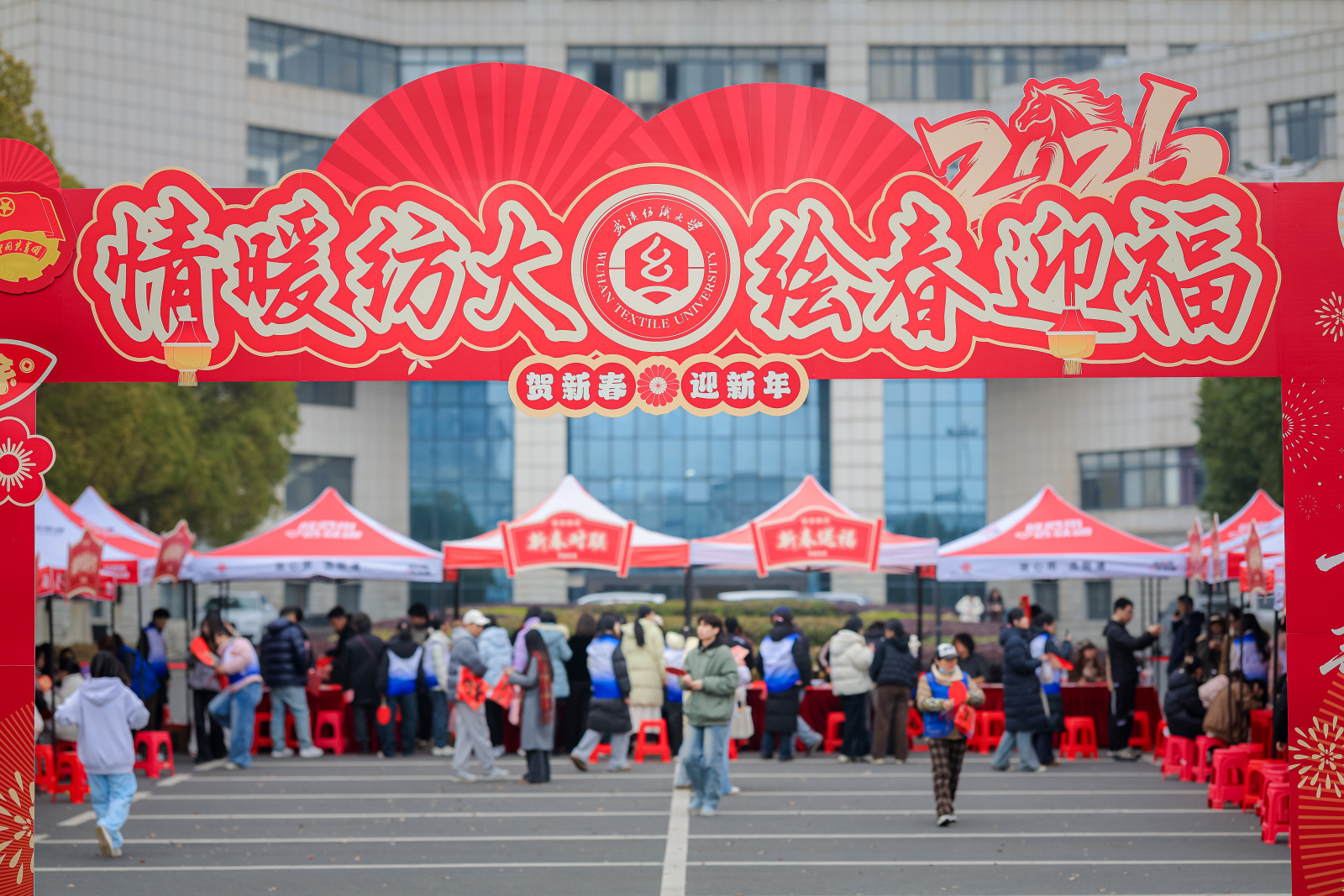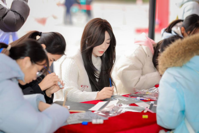 当天上午11时至14时,“情暖纺大 绘春迎福”活动在阳光校区二食堂前广场温暖开展。现场红灯笼高挂,福字满目,洋溢着喜庆祥和的节日氛围。湖北省书画协会书法专家与学生社团联袂挥毫,为师生书写春联与福字,传递笔墨祝福。同期开设花灯制作、拓印团扇、金箔画等十余项非遗及手工体验项目,师生在亲手创作中沉浸式感受传统文化魅力,留存冬日温暖记忆。