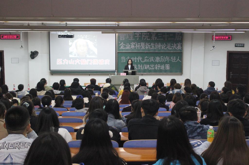 11月21日19:30,管理学院第三十二届“企业家杯”新生辩论赛总决赛在阳光校区03-T102精彩上演。本次辩论赛以“当今时代,应该激励年轻人找到/跳出舒适圈”为题,正反方分别为电商工管联队、信管物流联队。管理学院团委书记王双喜老师、2021级辅导员邓兰老师、管理学院学生会主席团成员以及大一新生观看了本次辩论赛。
