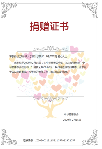 来自湖北宜昌的严昕雨同学说到,“看到目前疫情这个情况,一线的医务工作者那么辛苦。我跟家里说,我想捐款。家里非常支持,这些钱一半是我自己攒的,还有一半是我爸支持我的,他说他也想捐。父亲是一名建筑工人,最开始就一直在关注火神山和雷神山医院的建设情况,跟家里人普及建筑知识。他说要不是家里封路了,很想报名参加医院的建设。我很庆幸自己能出身在这样一个有爱的家庭里,等疫情过后,我还想带父母去武大看樱花”。